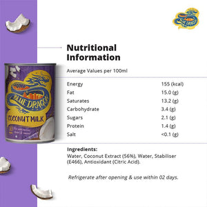 Bring the bold, exotic flavors of Asia into your kitchen with Blue Dragon Coconut Milk. Made from freshly pressed coconut kernels, this rich and creamy milk adds a subtle coconut flavor to both sweet and savory dishes. It’s a must-have ingredient for Thai curries, Indian gravies, Caribbean dishes, soups, smoothies, and desserts.