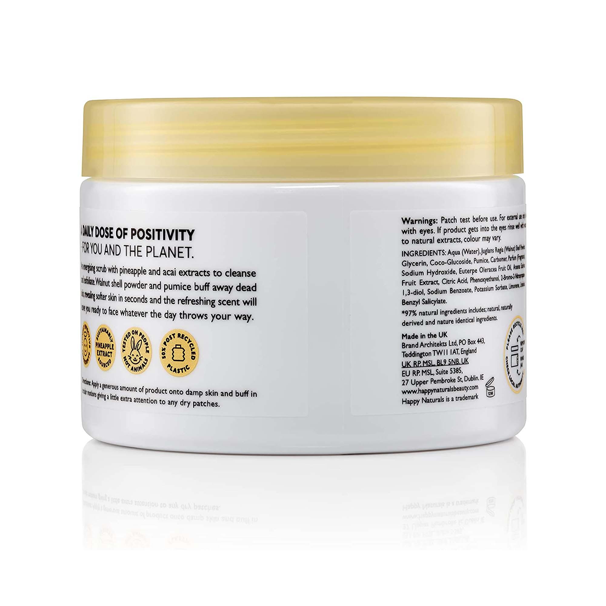Reawaken dull skin with the Happy Naturals Energising Body Scrub — a thick, jelly exfoliant that buffs away dead skin and reveals soft, radiant skin. Blended with sustainably sourced pineapple and açai extracts, natural pumice and walnut shell powder, this vegan-friendly scrub lifts impurities while delivering a fresh fruity scent.