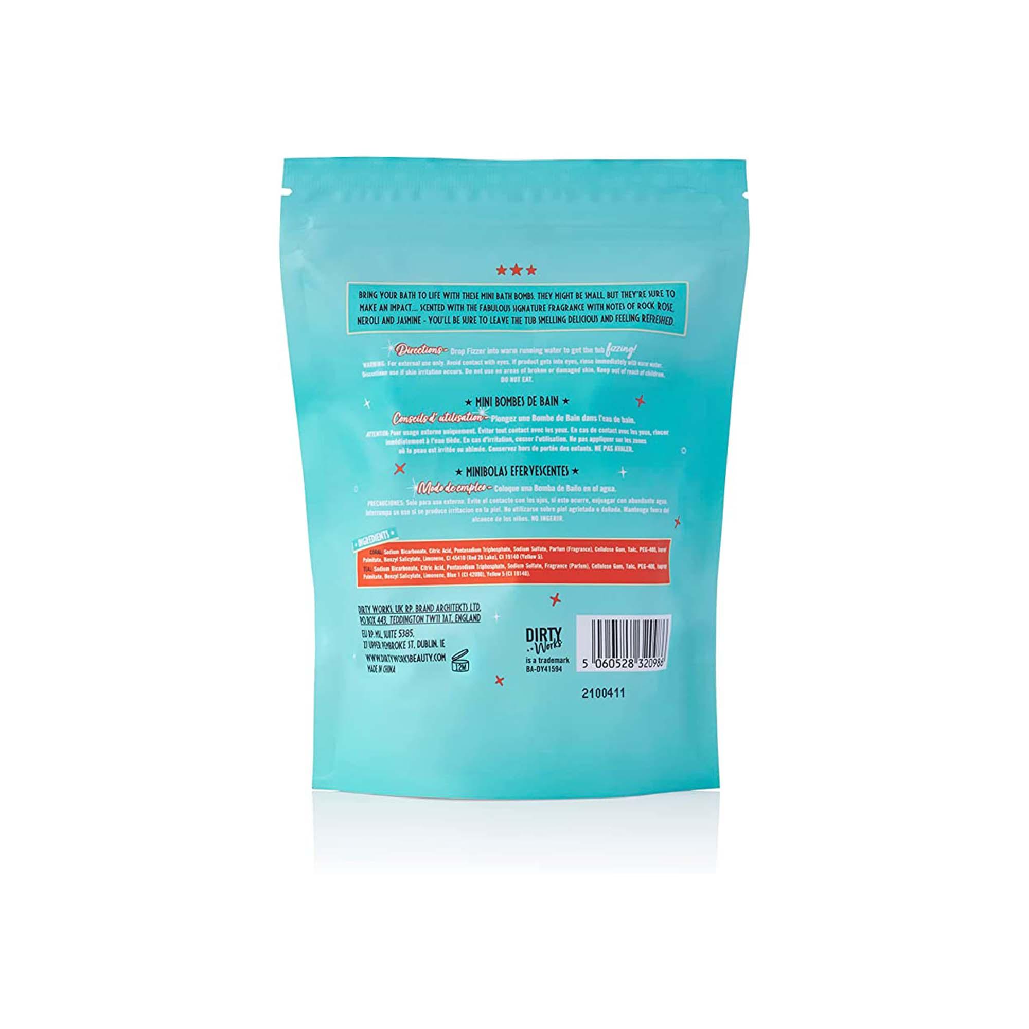 Getting Fizzy With It mini bath bomb set contains eight colourful fizzers that release Dirty Works’ signature scent and bubbles for pocket-sized pampering. Resealable bag keeps them fresh.