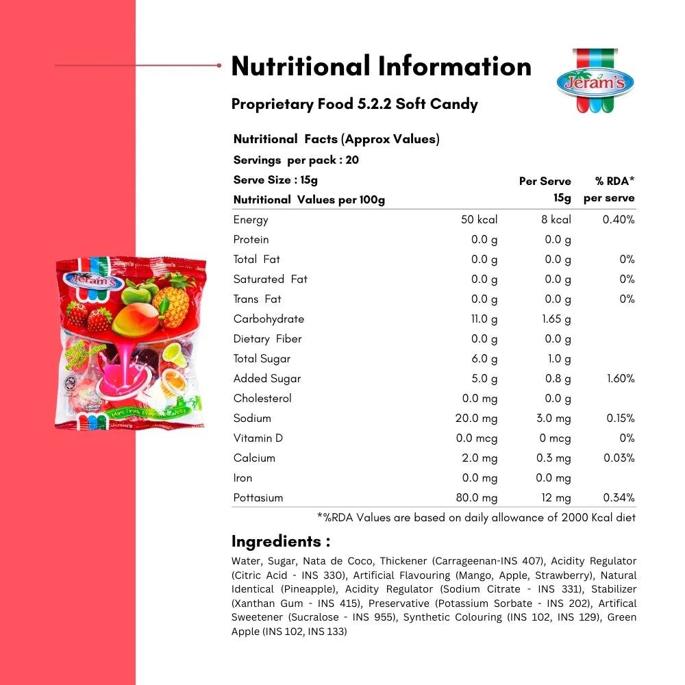 A handy pack of 20 bite-sized jelly cups in four fruity flavours — Mango, Strawberry, Green Apple and Pineapple. Jeram’s Mini Fruit Jelly is a family favourite: wobbly, sweet, and perfectly portioned for snacks, parties or lunchboxes.