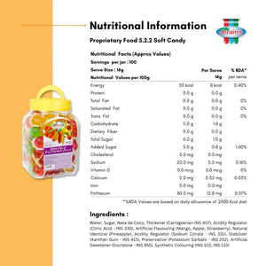- Assorted fruity flavours: apple, pineapple, mango, strawberry.