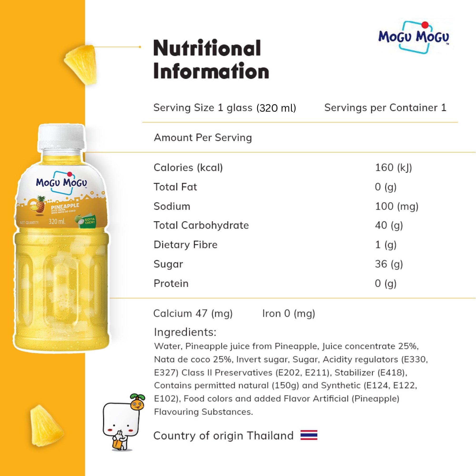 Refreshing Fruit Drink with Nata de coco in various flavours Recharge yourself with fruit and fruit fibres packed in a bottle of Mogu Mogu A Fun Drink with actual chewy pieces Imported in India from Thailand, the tropical land of fruits Avaliable in more than 60 countries in the world