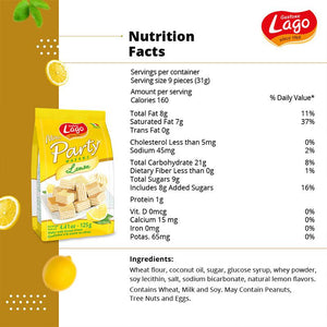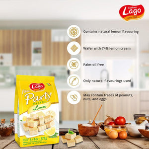 When life gives you lemons, snack on them with Gastone Lago Lemon Cream Mini Party Wafers. Crisp wafer cubes filled with tangy lemon cream deliver a burst of citrus freshness with a creamy twist. These wafers are a zesty pick-me-up for any occasion.