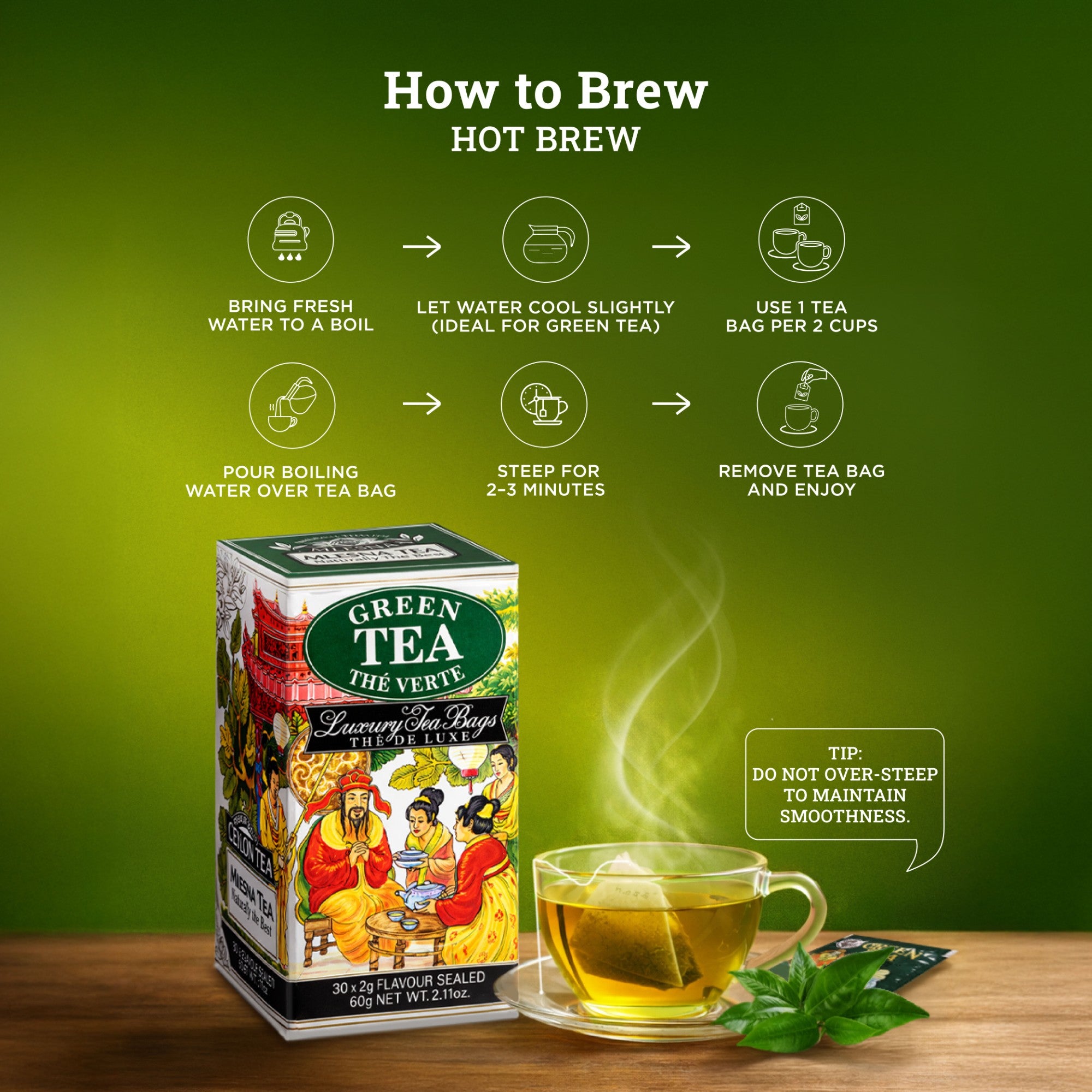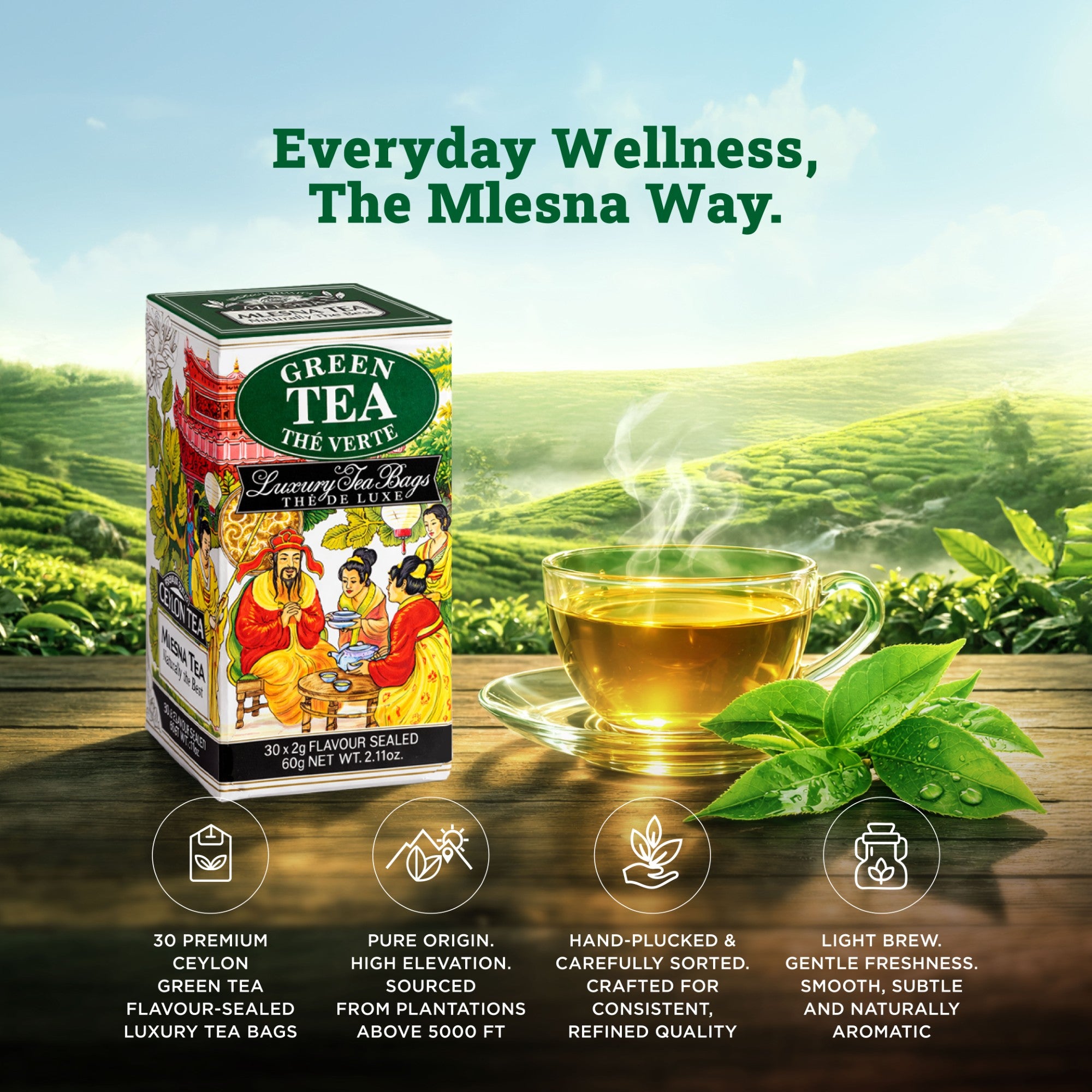 Mlesna Green Tea – The Vert 60g | Premium Luxury Green Tea Bags | 30 Foil-Sealed Tea Bags | Light & Refreshing Green Tea | Imported from Sri Lanka