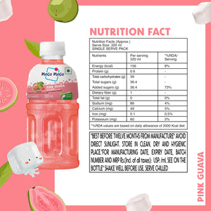 Indulge in the tropical goodness of Mogu Mogu Guava Juice with Nata de Coco | 320ml. A premium beverage imported directly from Thailand. Crafted with 10% real guava and 15% nata de coco. This drink delivers a perfect balance of natural sweetness and chewy texture, making every sip a delightful experience.