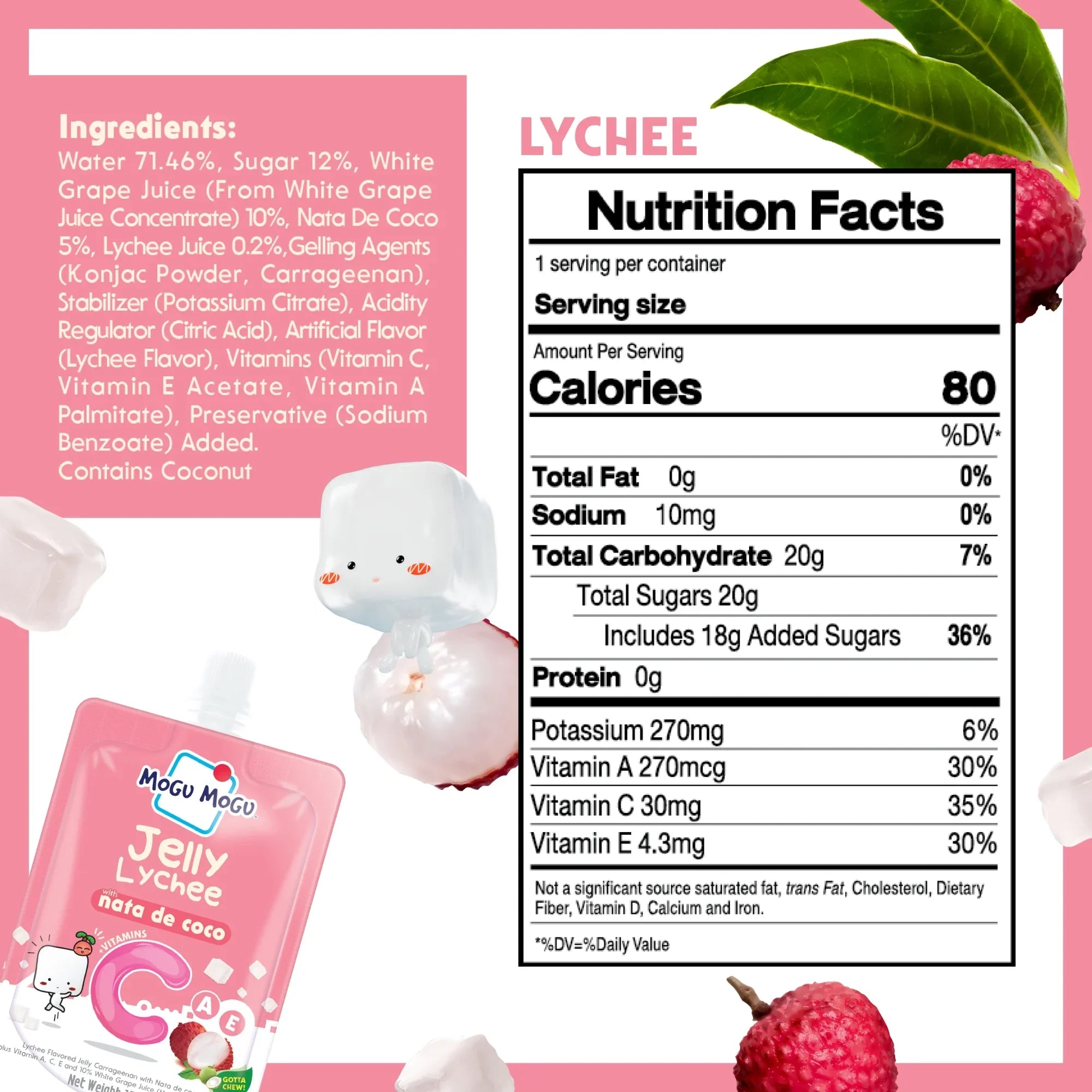 Delight in the tropical taste of Mogu Mogu Jelly Lychee with Nata De Coco 150g. This unique drink-and-jelly blend features the sweet flavor of lychee perfectly combined with soft, chewy coconut jelly. Crafted with 10% real white grape juice, it also contains essential Vitamins A, C, and E, making it a delicious and nourishing treat. The convenient 150g pouch is lightweight and portable, perfect for a fruity snack at school, the office, or while traveling. To enjoy, simply chill, shake well, twist the cap, and squeeze. Every sip delivers a refreshing lychee flavor and a fun texture. This jelly drink is fat-free, making it a guilt-free option loved by kids and adults alike. 😋