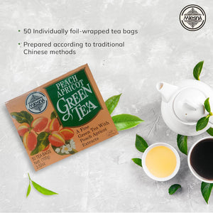 - 50 foil-wrapped tea bags with natural peach & apricot extracts