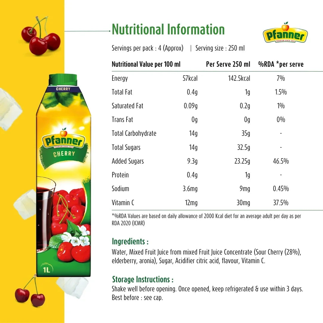 Experience a bold, fruity kick with Pfanner Cherry Juice. This vibrant juice combines 30% fruit content with the tangy taste of sour cherry and a hint of elderberry for a rich, crimson tart delight. It's a zesty, juicy, and refreshing beverage that offers a timeless flavor with a modern twist. The perfect choice for a sophisticated sip.