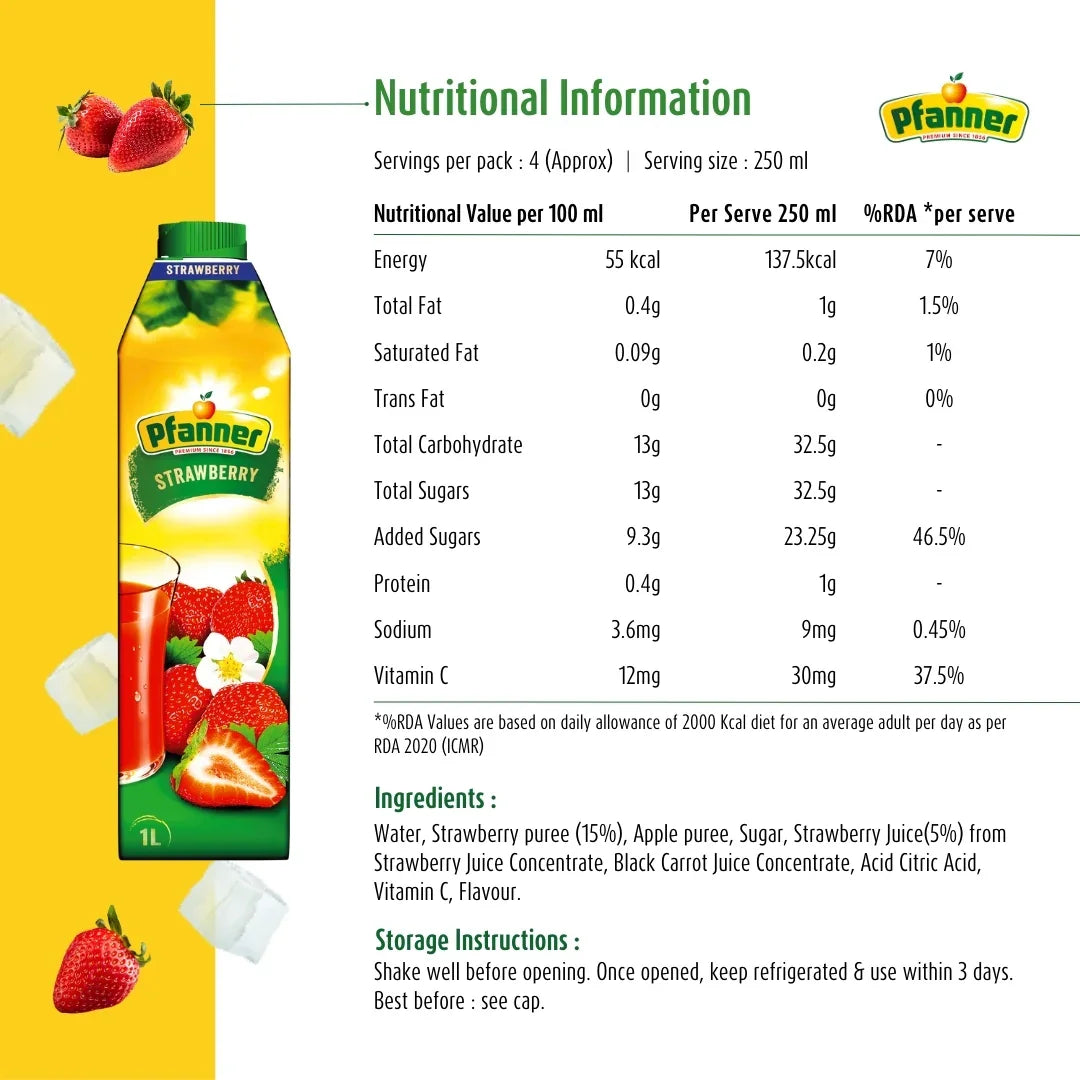 Sip on a taste of pure sunshine with Pfanner Strawberry Juice. This delightful juice is a lush, fruity blend with 30% fruit content, including 15% strawberry purée and 5% strawberry juice. The result is a pulpy perfection with a creamy-smooth texture and a garden-fresh flavor that's both rich and authentic. It's a pure, delicious treat for any occasion.