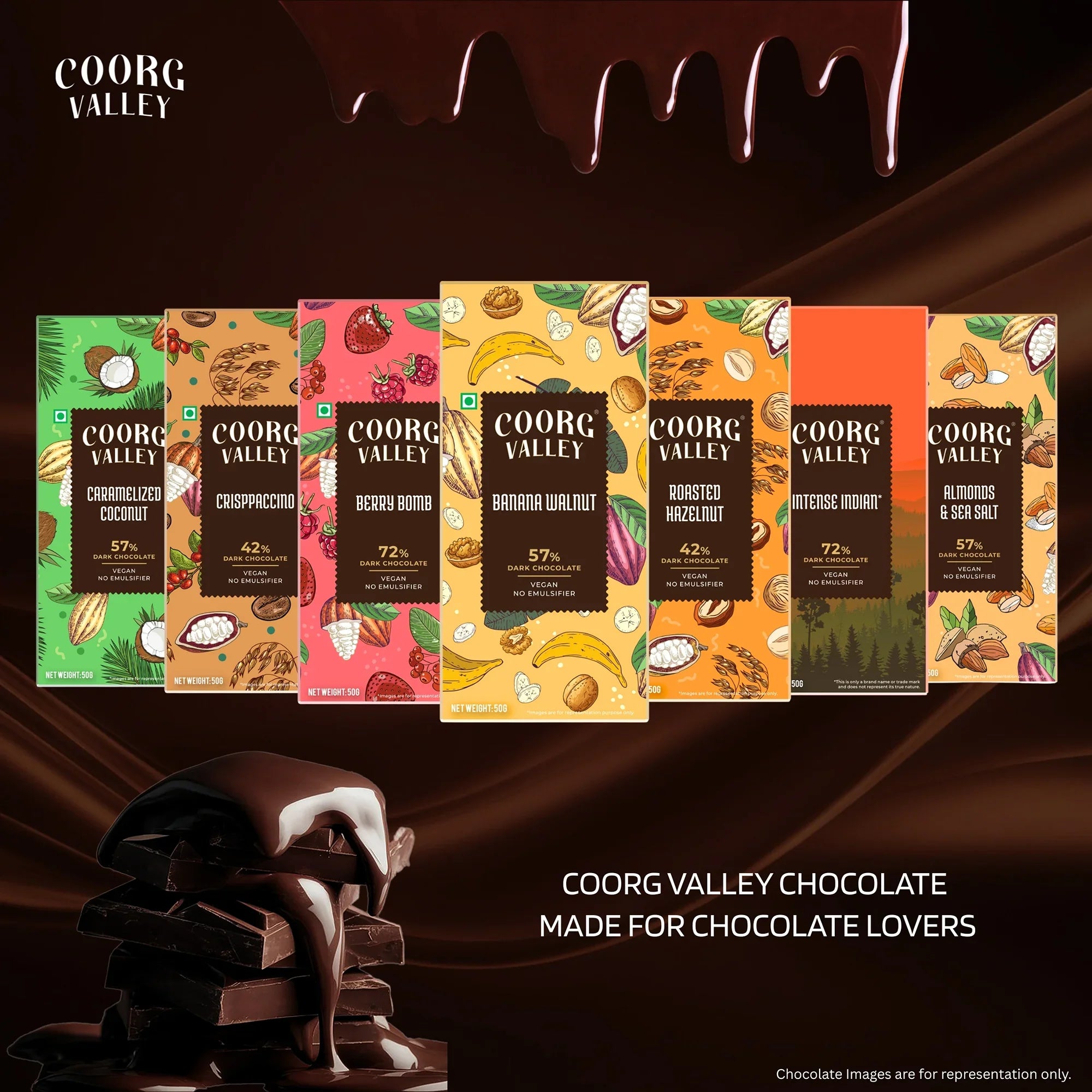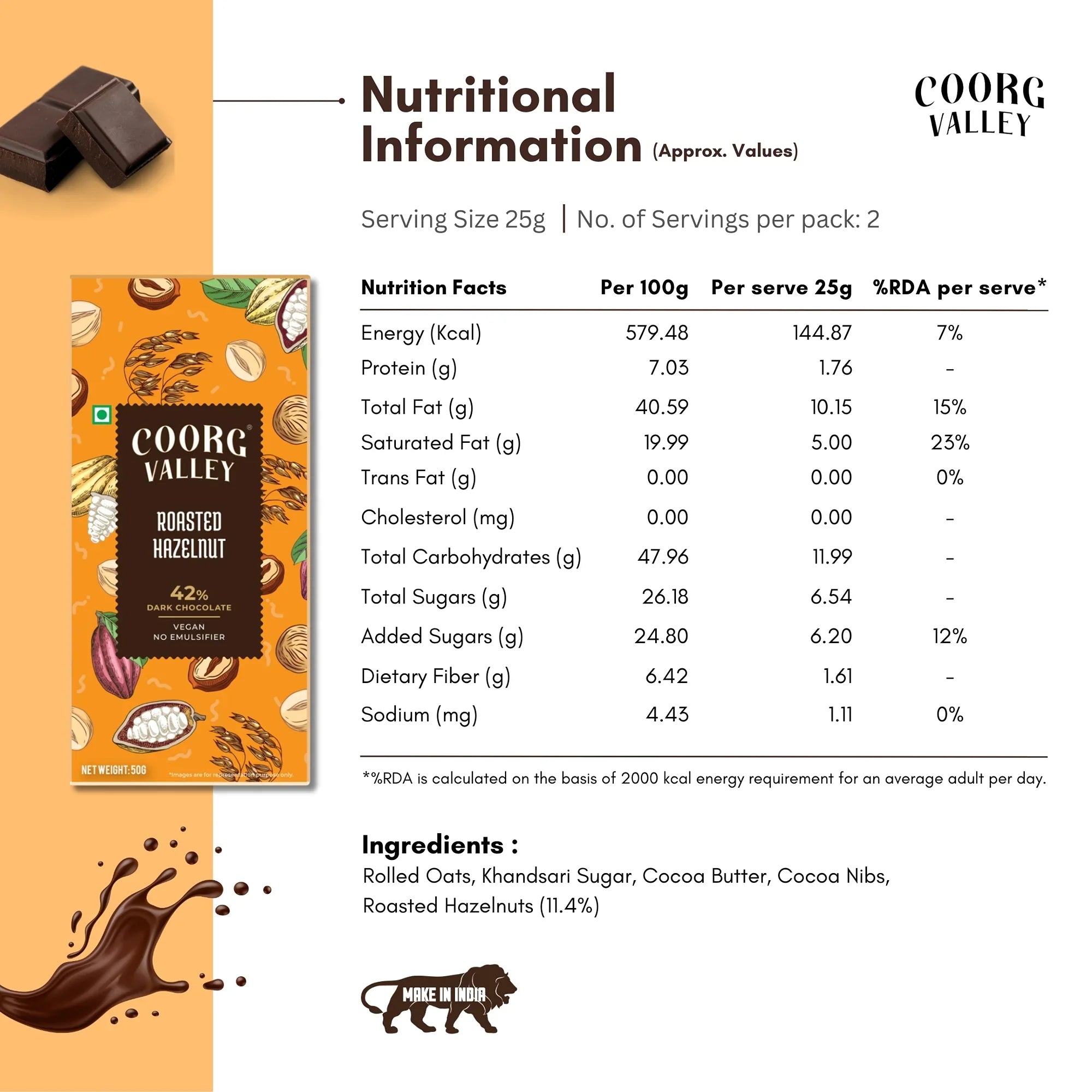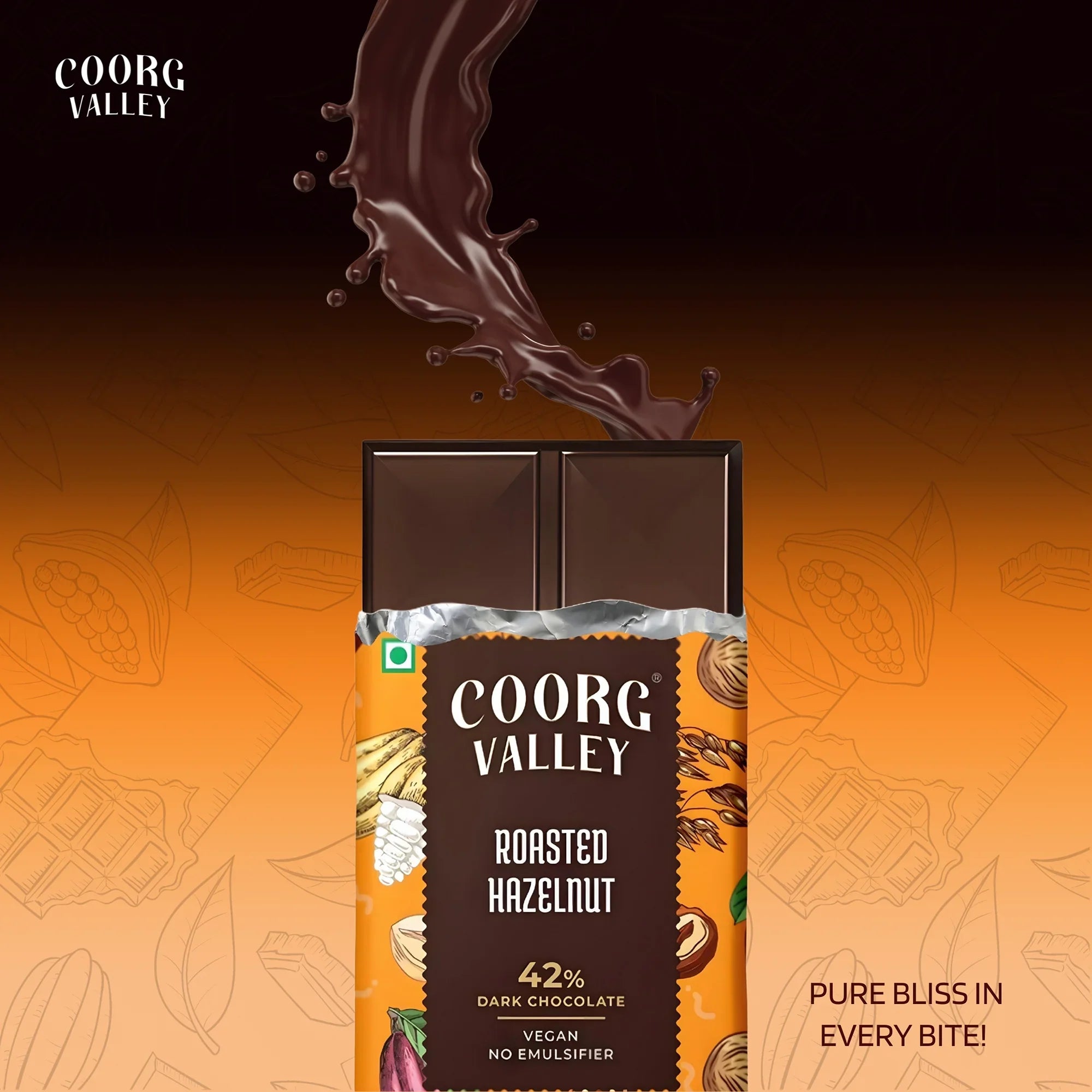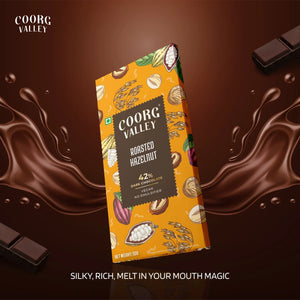 Coorg Valley Roasted Hazelnut Chocolate blends rich dark chocolate with crunchy roasted hazelnuts for a delicious treat. Naturally sweetened with Khandsari sugar and free from emulsifiers or additives, it offers pure indulgence with wholesome benefits. Crafted with cocoa nibs and butter, it delivers antioxidants and deep, satisfying flavor.