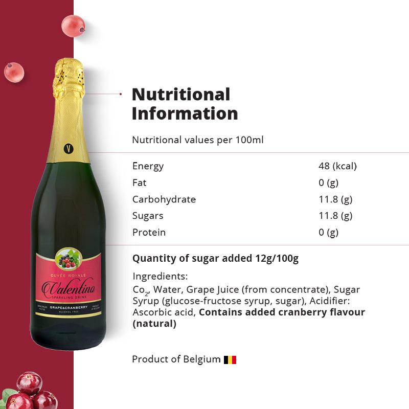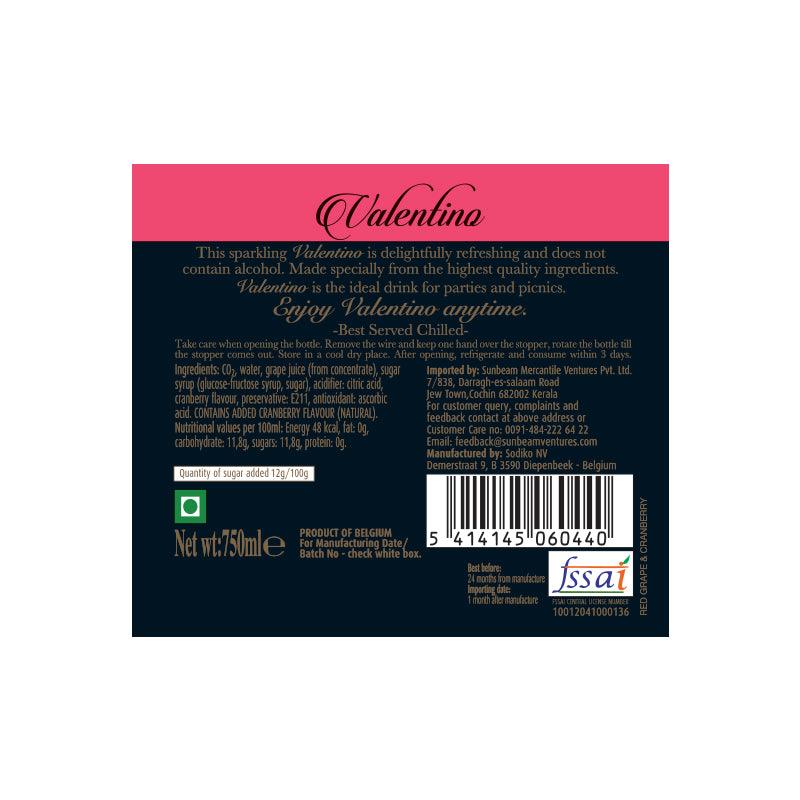 Savour the perfect balance of sweet and tart with Valentino Sparkling Grape & Cranberry Drink. Combining the juiciness of grapes with the refreshing sharpness of cranberries, this Belgian-crafted non-alcoholic drink is perfect for holiday celebrations, festive toasts, and elegant dinners.