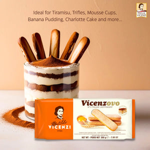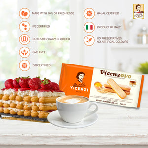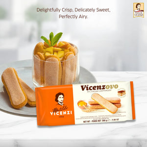 Crafted in Italy using the original Vicenzovo recipe, these premium Savoiardi biscuits are known for their signature elongated shape, airy sponge-like texture, and delicate crispness. Made with high-quality ingredients and 26% fresh eggs, each biscuit absorbs flavours beautifully — making them the No.1 choice for authentic tiramisù and layered desserts.