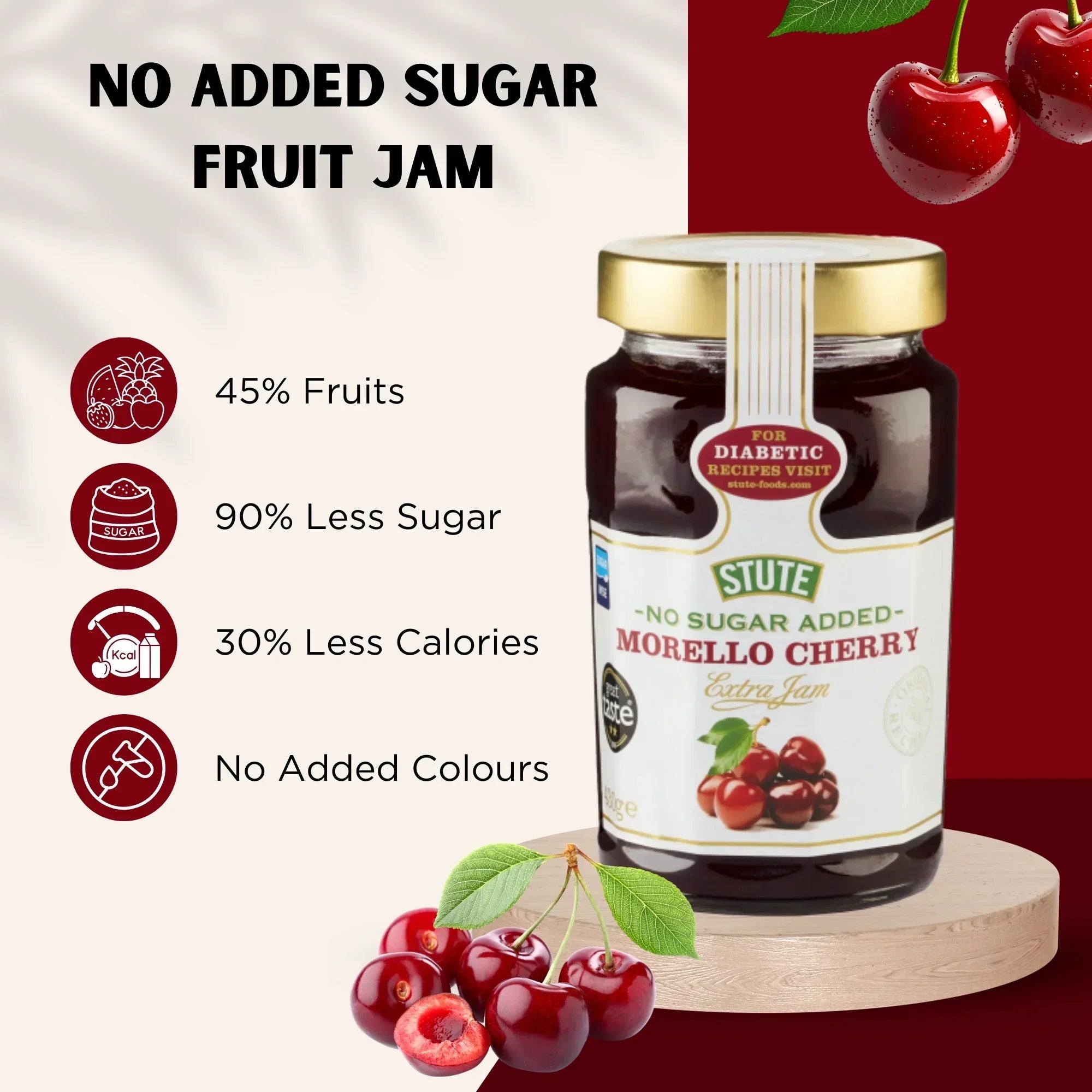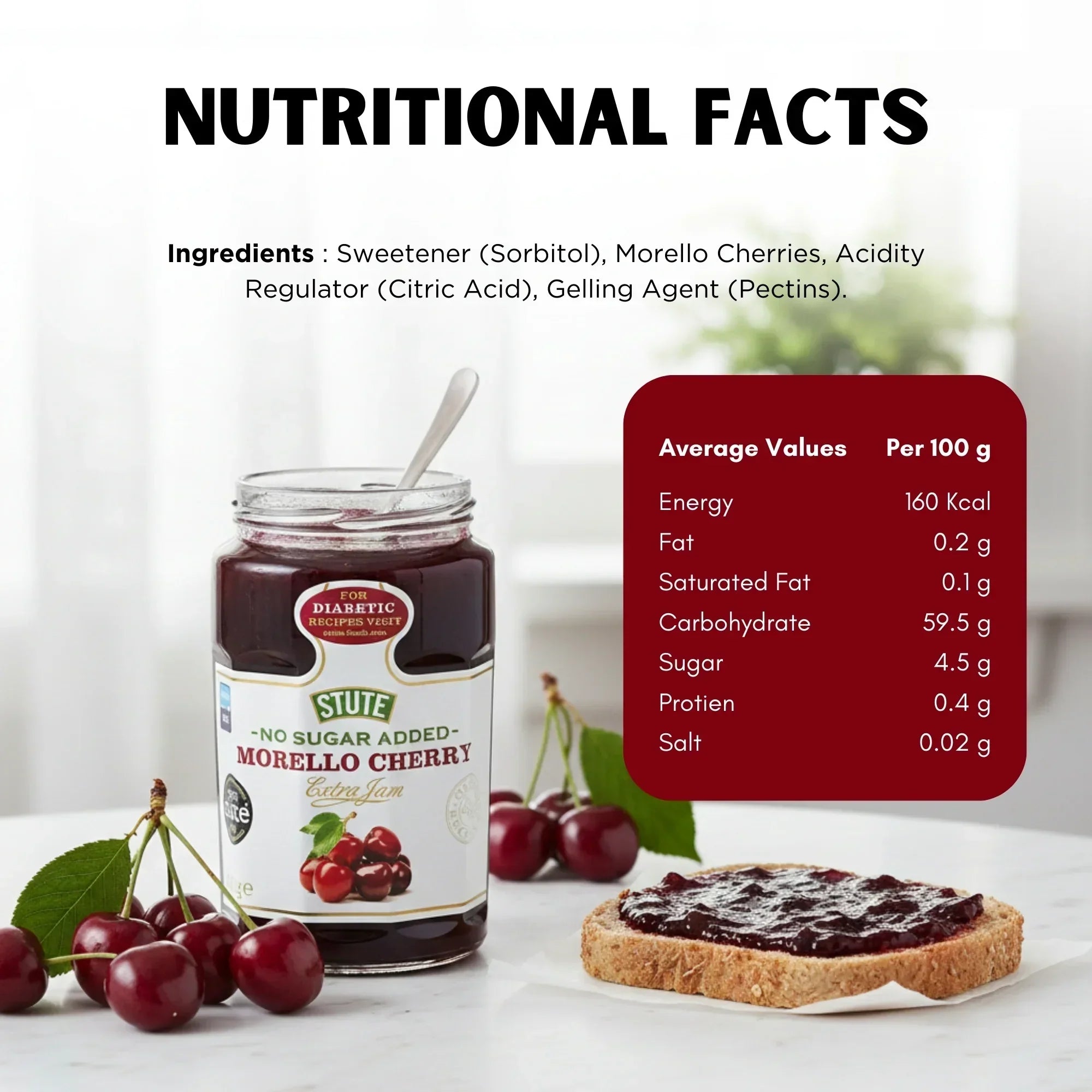 Intensely Tart Morello Cherry Jam, Sugar-Free. For those who prefer a deeper, more sophisticated fruit flavor, our Sugar-Free Morello Cherry Jam is a perfect choice. This jam offers an intense, slightly tart, and deeply fruity taste that will satisfy your craving for authentic cherry flavor.