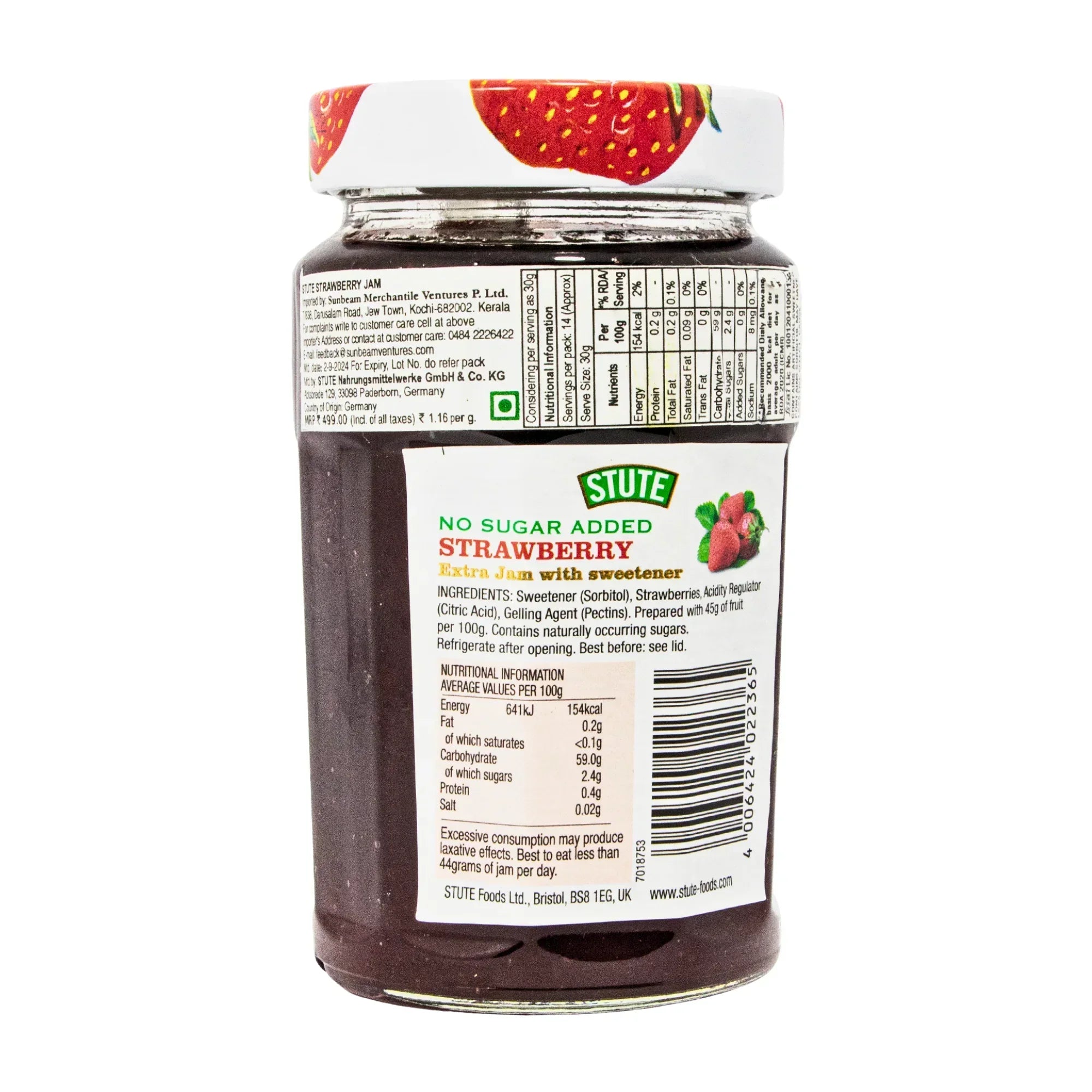 A Guilt-Free Classic: Strawberry Jam. We’ve captured the fragrant, juicy sweetness of ripe summer strawberries in this classic jam. Stute's Sugar-Free Strawberry Jam is a bright, vibrant, and naturally fruity spread that fits perfectly into a balanced eating plan. It’s a guilt-free way to enjoy a timeless favorite.