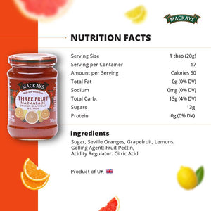 Orange, lemon and lime in harmony — Mackays Three Fruit Marmalade is zesty and complex. The citrus trio creates bright acidity with a layered sweetness that makes it an excellent base for vinaigrettes, cocktail syrups or a citrus-flecked cheesecake filling.