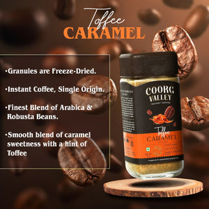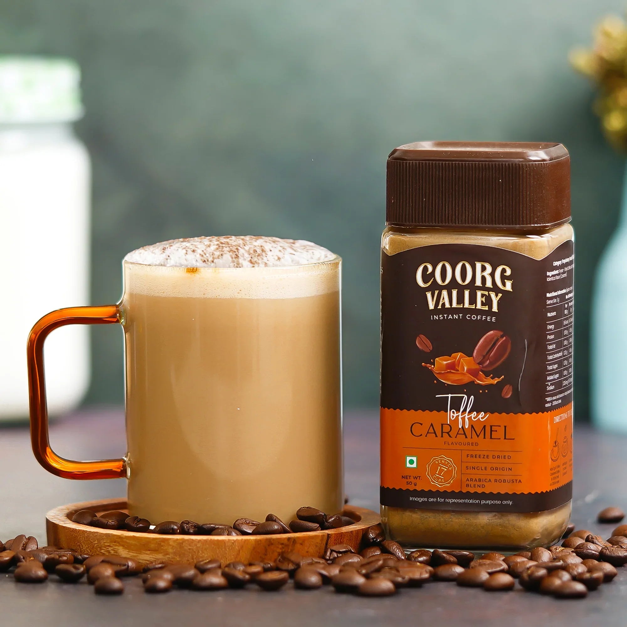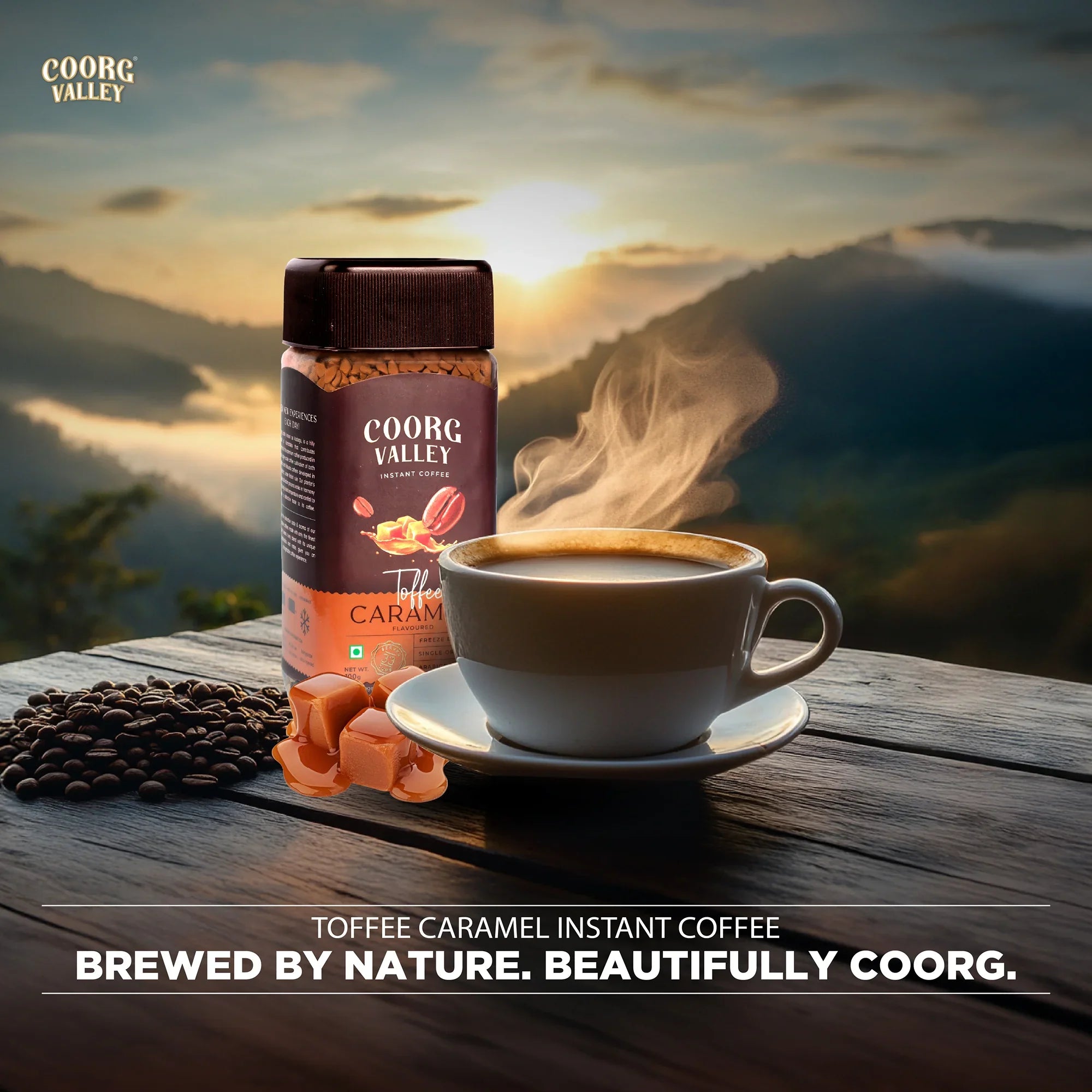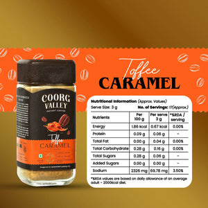 Treat yourself to the indulgent taste of Coorg Valley Toffee Caramel Instant Coffee. A luxurious blend of single-origin Arabica and Robusta beans, this freeze-dried instant coffee offers a perfect balance of rich, smooth coffee with the sweet, buttery twist of toffee and caramel.
