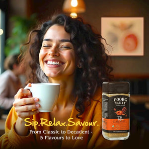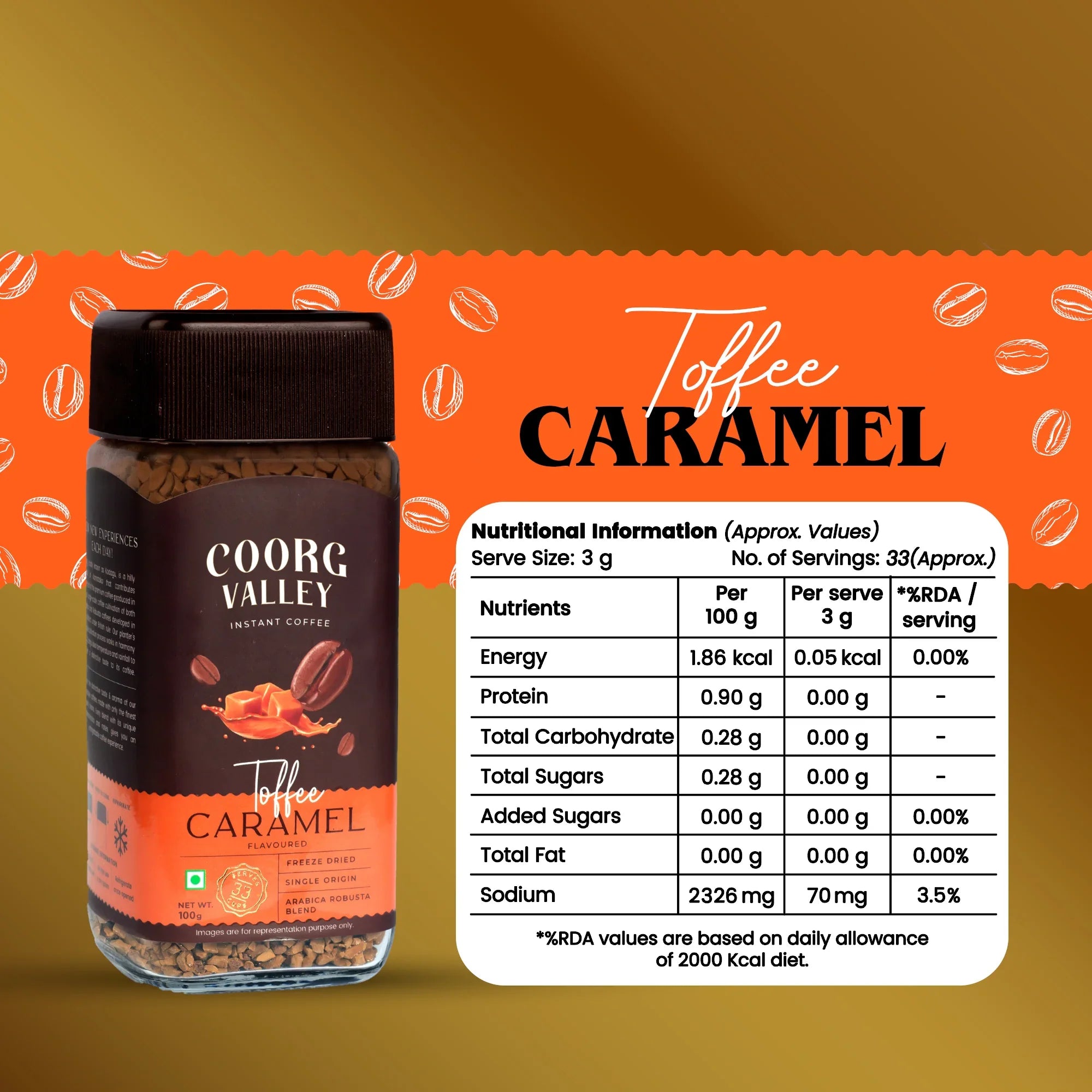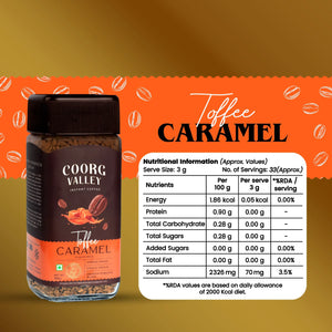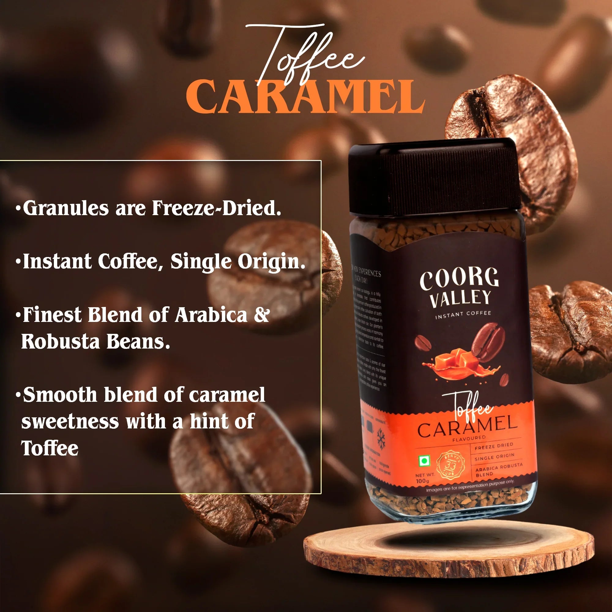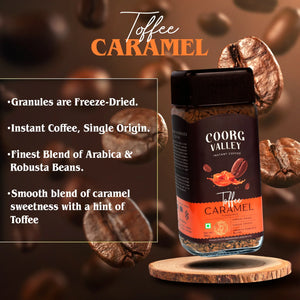 Prepare to be swept away by the decadent richness of our Coorg Valley Toffee Caramel Instant Coffee. This is your coffee break, reimagined as a sweet indulgence. We've taken our robust Coorg coffee beans and transformed them into a liquid dessert, infusing them with the smooth, buttery essence of toffee and caramel. The result is a velvety-rich, aromatic cup that satisfies your sweet cravings without a trip to the pastry shop.
