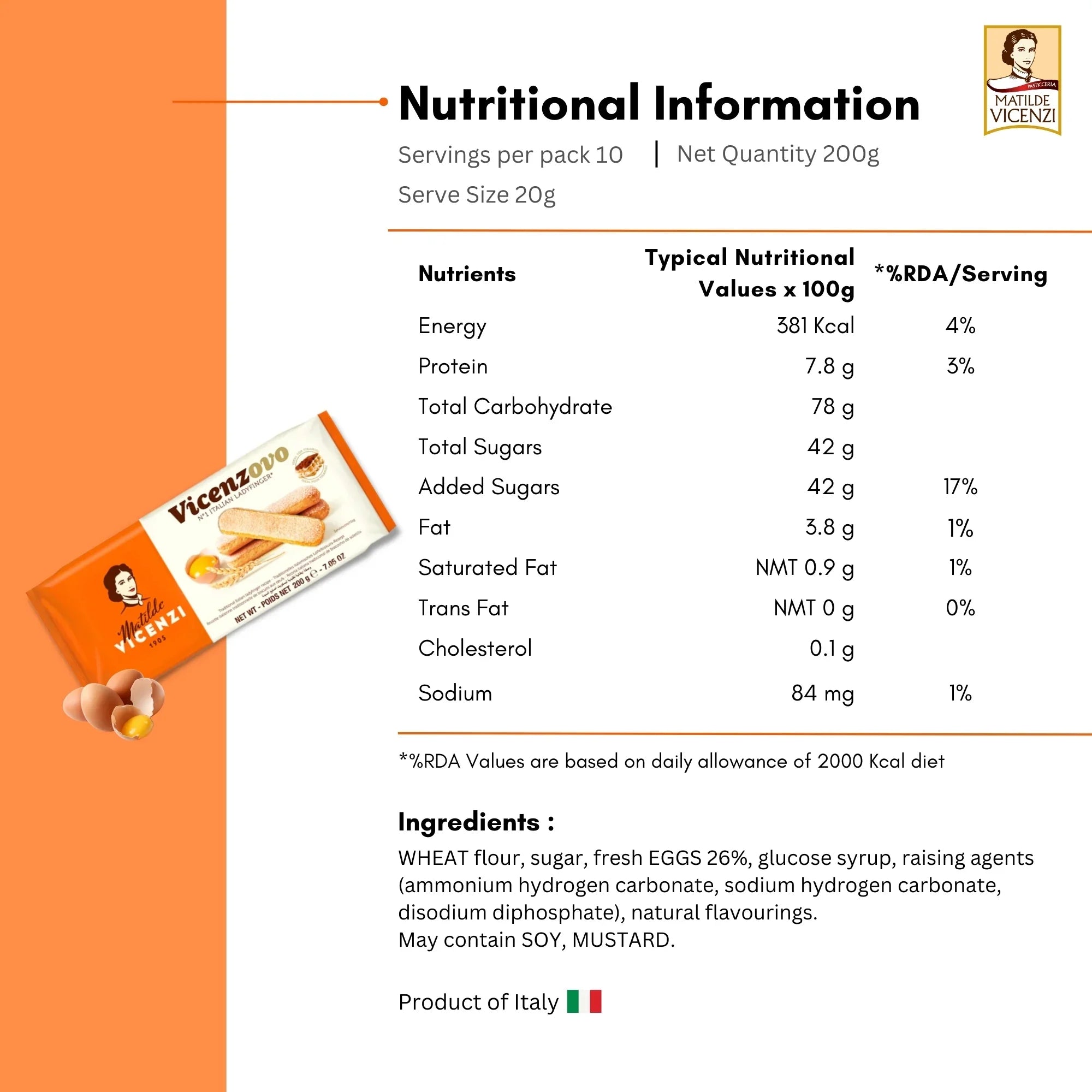The Vicenzovo Ladyfinger Biscuits are a hallmark of authenticity and quality — made with 26% fresh eggs and following the original certified recipe that earned Italy’s first-ever product certification. Light, spongy, and delicately crisp, these Savoiardi biscuits absorb moisture perfectly, making them the preferred choice for creamy desserts and elegant coffee pairings.