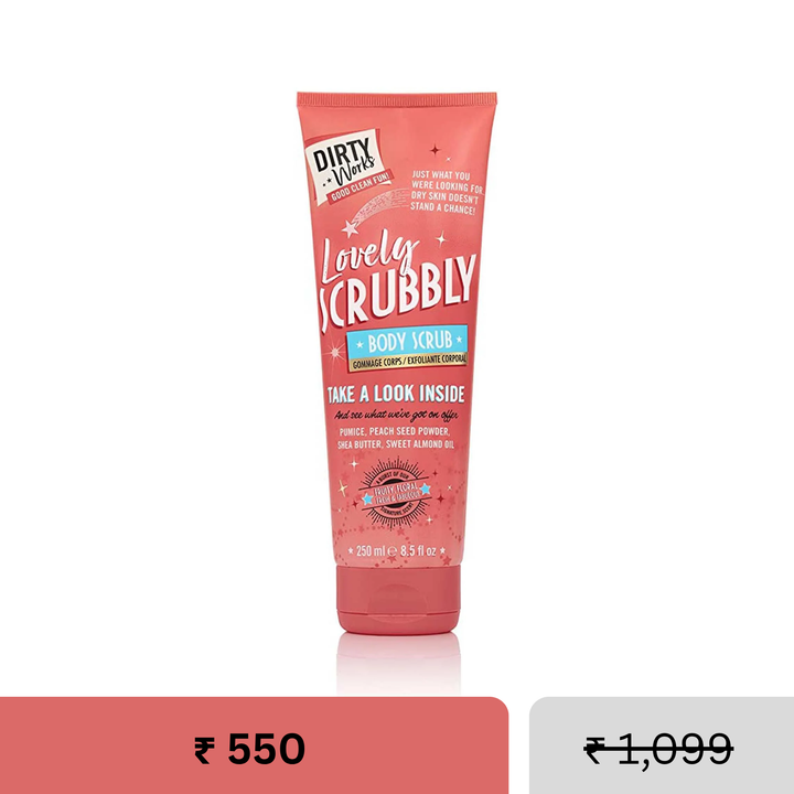 DIRTY WORKS LOVELY SCRUBBLY BODY SCRUB: Dry skin doesn’t stand a chance with our super moisturising body scrub from Dirty Works. Gently buff away dead and dry skin with the Lovely Scrubbly exfoliant, perfect for total body pampering. Lightly fragranced with our signature scent, available in a 250ml tube. Vegetarian friendly!