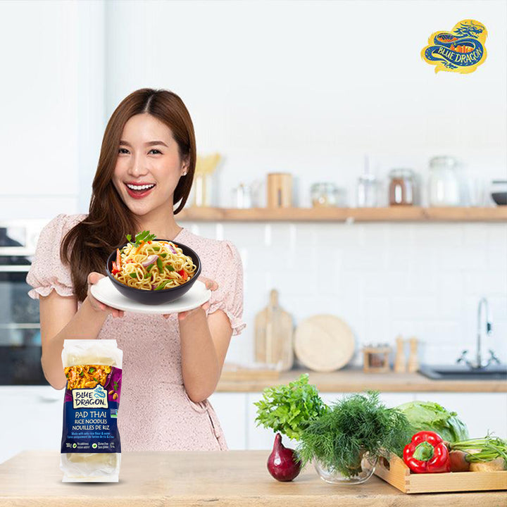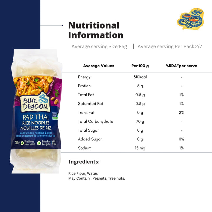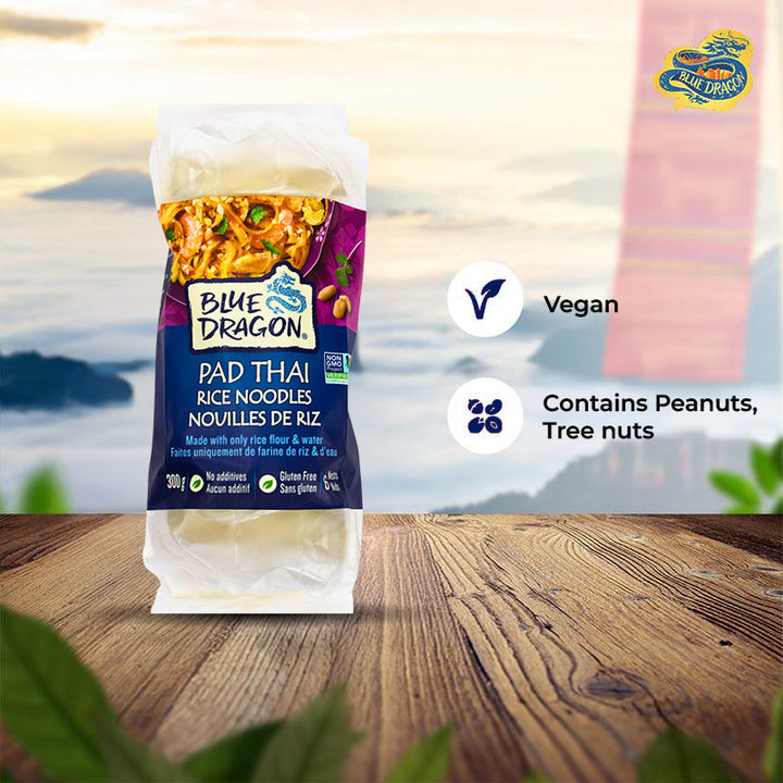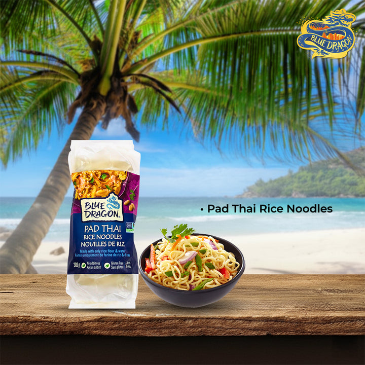 Create delicious Asian dishes at home with Blue Dragon Pad Thai Rice Noodle. Made in Thailand with just two ingredients—rice flour and water—these noodles are naturally gluten-free and come in 4 portioned nests, making them easy to cook and serve.