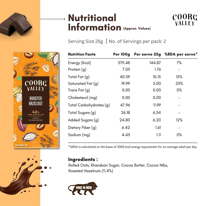• Premium Coorg Cocoa: Crafted with rich, aromatic cocoa sourced from the lush valleys of Coorg.